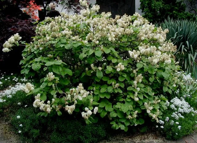 1-1,5 méteres magasságot elérő, tőből elágazó lombhullató díszcserje, mely őszi levélszínével, valamint virágaival is díszít. Levélzetét sötétzöld, fényes felületű levelek alkotják, a levelek fonákja kékesfehér árnyalatú. Őszi lombja, sárga, narancssárga és vöröses árnyalatban játszik. Fehér virágai áprilisban nyílnak.