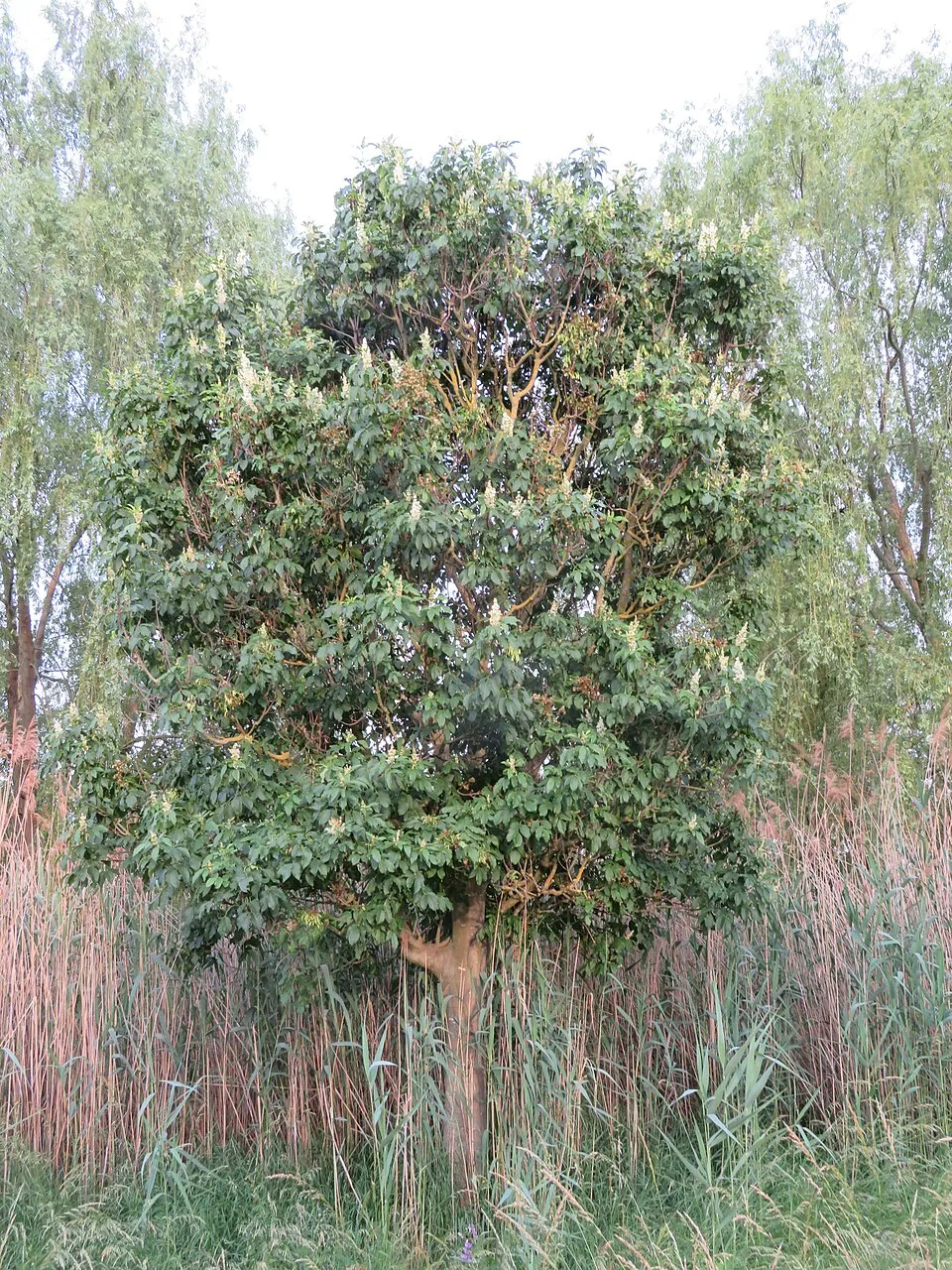 6-10 méteres, kúpos, majd gömbölyded koronájú fa. Szürke rügyei vannak, levelei sötétzöldek, ősszel sárgás vagy lilásbarnák. Virága ezüstös, sárgásfehér, a vesszők végén dús bugákban májusban nyílnak, illatosak. Szárazságtűrő, napos meleg helyet kedveli.