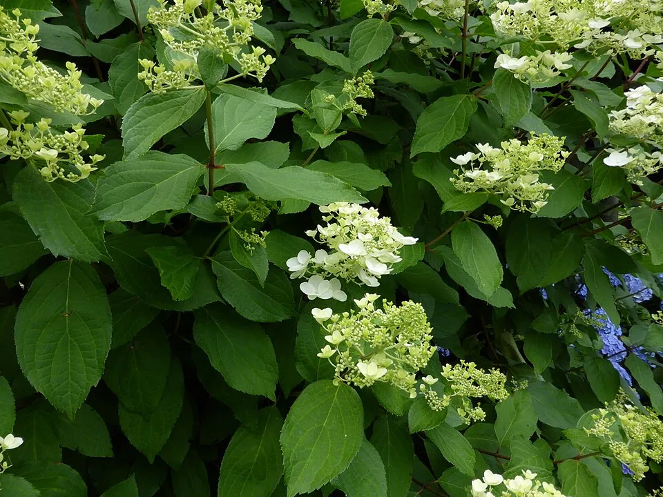 1,5-2 m magas, bokros növekedésű, erős levélzetű, felálló ágrendszerű, lombhullató cserje. Levelei sötétzöldek. Virágai kúpos, buga virágzatában megfigyelhetőek a kisebb méretű fertilis és a nagyobb méretű meddő virágok. A meddő virágok fehér színűek, de augusztus végére rózsaszínűek. Kissé laza, humuszos, tápdús, mészmentes vagy savanyú talajba, napos vagy félárnyékos helyre ültessük.