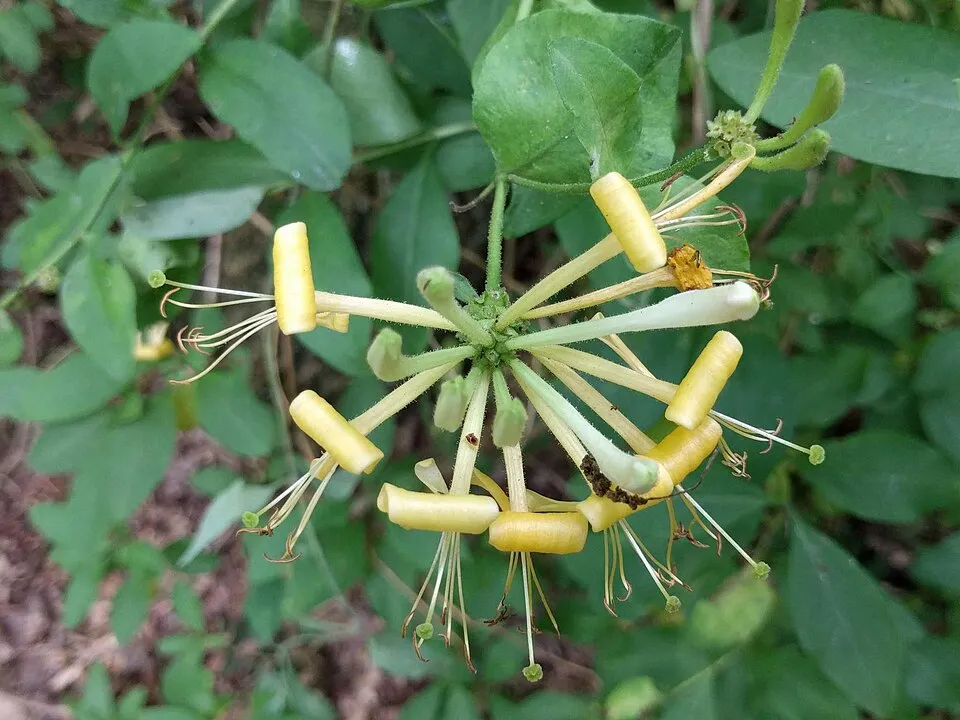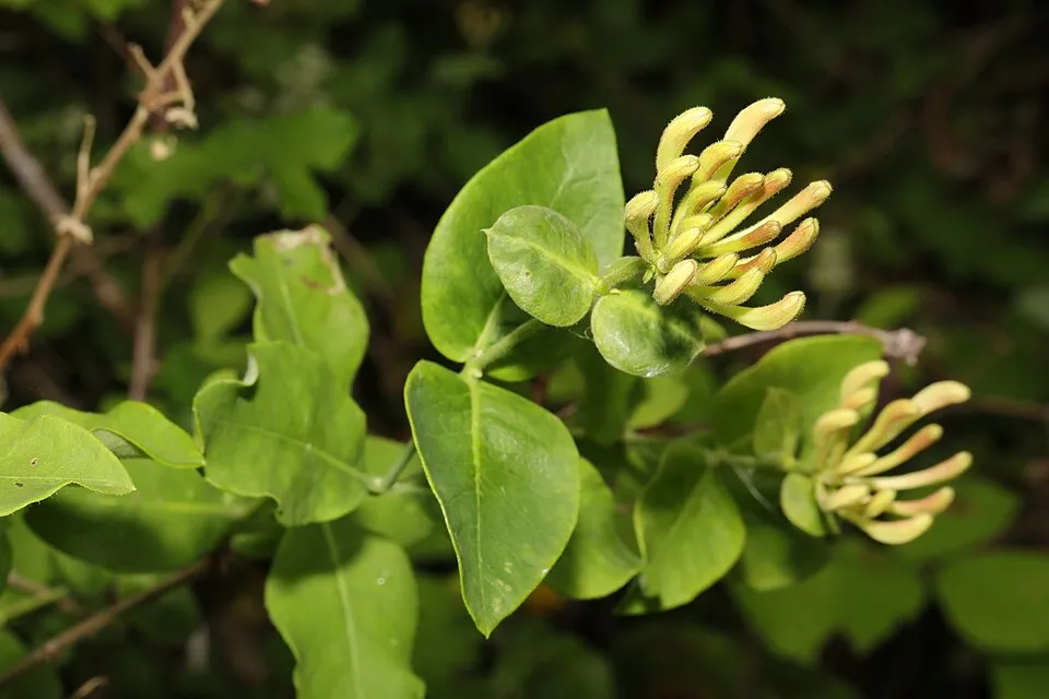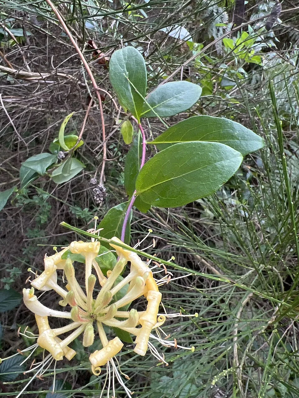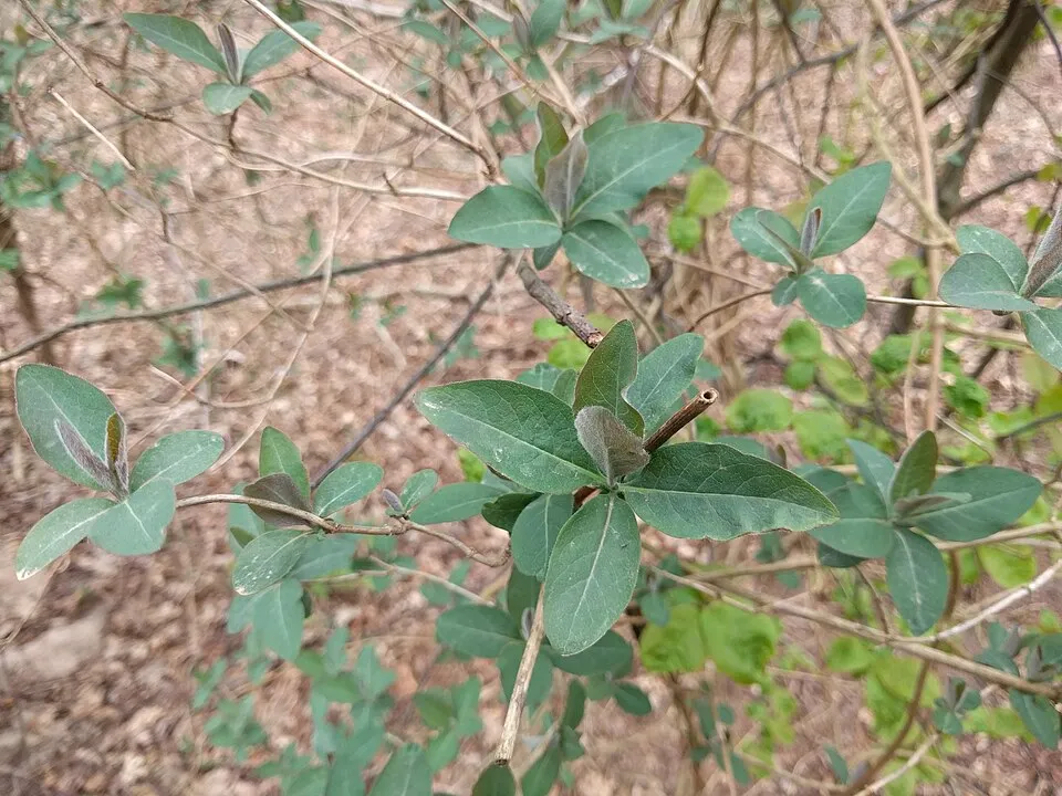 3-4 m magasra kúszó, 4-6 cm hosszúkás, tojásdad, sötétzöld levelű cserje. Jellegzetessége, hogy a levél fonákja kékes-zöld színű, a legfelső levélpár nem nőtt össze. Virágai 3-5 örvbe álló füzér, belül sárga, kívül lilás-piros. Augusztus–szeptember a virágzási ideje. Termése élénkvörös. A talaj típusára nem igazán kényes, egyedül az a lényeges, hogy jó vízáteresztő talajba ültessük. Átlagos vízigényű növény, rendszeres, mérsékelt öntözést igényel, tartsuk földjét, mindig kissé nyirkosan.