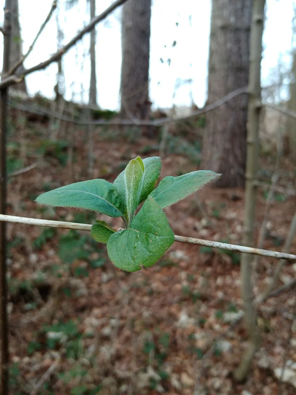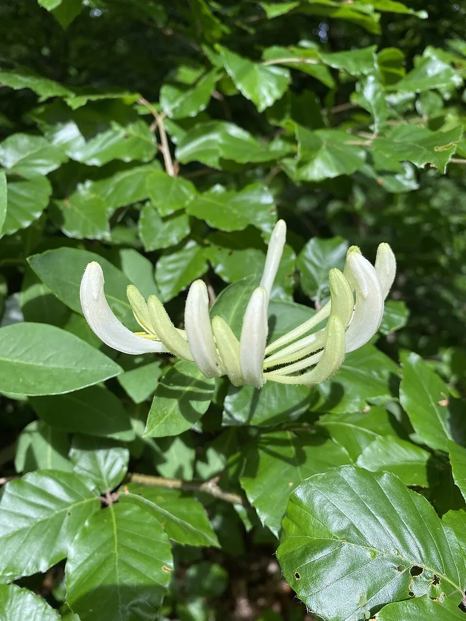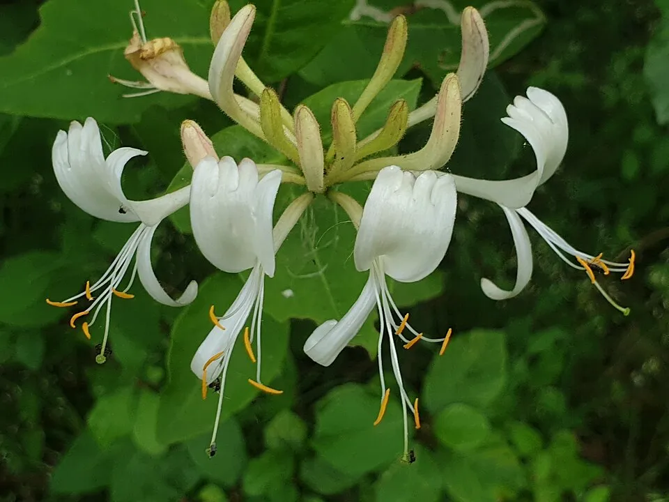 3-4 m magasra kúszó, 4-6 cm hosszúkás, tojásdad, sötétzöld levelű cserje. Jellegzetessége, hogy a levél fonákja kékes-zöld színű, a legfelső levélpár nem nőtt össze. Virágai 3-5 örvbe álló füzér, belül sárga, kívül lilás-piros. Augusztus–szeptember a virágzási ideje. Termése élénkvörös. A talaj típusára nem igazán kényes, egyedül az a lényeges, hogy jó vízáteresztő talajba ültessük. Átlagos vízigényű növény, rendszeres, mérsékelt öntözést igényel, tartsuk földjét, mindig kissé nyirkosan.