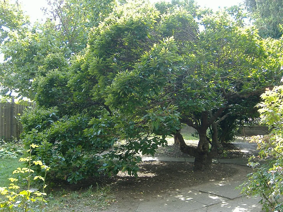 3-4 m magas sűrű, lapított gömbkoronájú bokor, koronába oltva kis fa. Hajtásai vastag, rövid ízközzel és lassú növekedéssel bírnak. Levelei fényeszöldek, kissé szabálytalan alakú, nem karéjos. Virága zöld fűzérei csak hímivarú virágokból állnak, ezért termést nem hoz. Bokor alakú oltványai sziklakertbe, alacsony törzsre oltott koronás példányai házikertbe, előkertbe vagy edénybe ültethetőek.