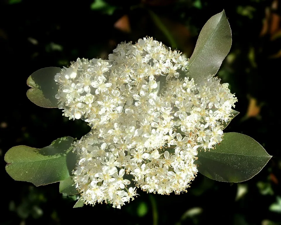 2-3 m magas, sűrű, felálló ágrendszerű örökzöld cserje. Levele fényesen sötétzöld, tojásdad, a friss hajtásokon élénkpiros színűek. Lilásbordó színű lombjával egész évben díszít. Fehér virágai tavasz végén és nyár elején jelennek meg áprilisban és májusban. Napos vagy félárnyékos, védett fekvésbe telepíthető, hirtelen hidegtől friss hajtásai visszafagyhatnak.