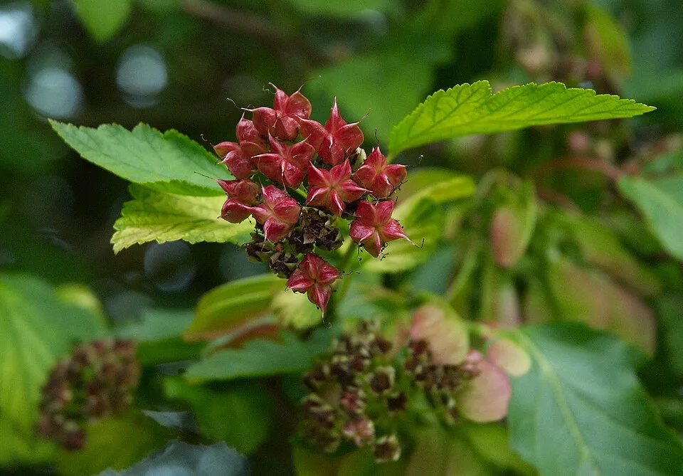 2 m magas, sűrű ágrendszerű színes levelű bokor, az idősebb ágakról összefüggő darabokban hámló kéreggel. Gyönyörű arany lombozata nagyon vonzó. Kis juhar szerű levelei intenzív sárga színnel kezd hajtani. Napos helyre ültetve egész évben megtartja színét, árnyékosabb fekvésben zöldes árnyalatúvá válnak. Késő tavasszal, vagy kora nyáron nyílnak feltűnő fehér félgömb alakú virágai. Virágzás után kis ovális gyümölcsöt nevel, gyümölcsei ősszel pirosra színeződnek. Napra vagy félárnyékba ültethető, talajokban nem válogat.