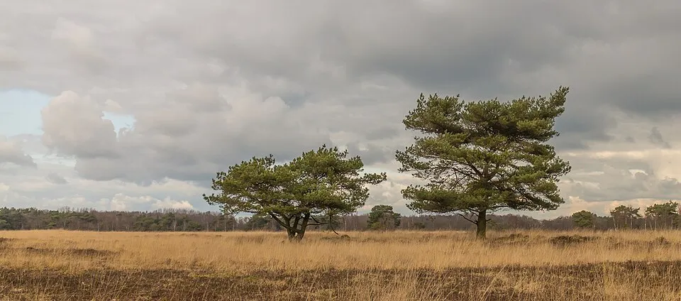 Erdei állományban 40 m-t is elérő magas fa. Koronája kúp alakú, kifejlődve laza, kiszélesedő, ernyőszerű. Törzse magas, ágtiszta. Kérge eleinte szürke, később narancs- vagy rozsdavörös. Kéttűs fenyő, kékes- vagy szürkészöld, széles, lapos tűlevelei 5-7 cm-esek. Kicsi 4-6 cm-es tobozai sötét szürkés-barna, a második évben érnek. Savanyú és a meszes talajon is megél. A szárazságot jól viseli.