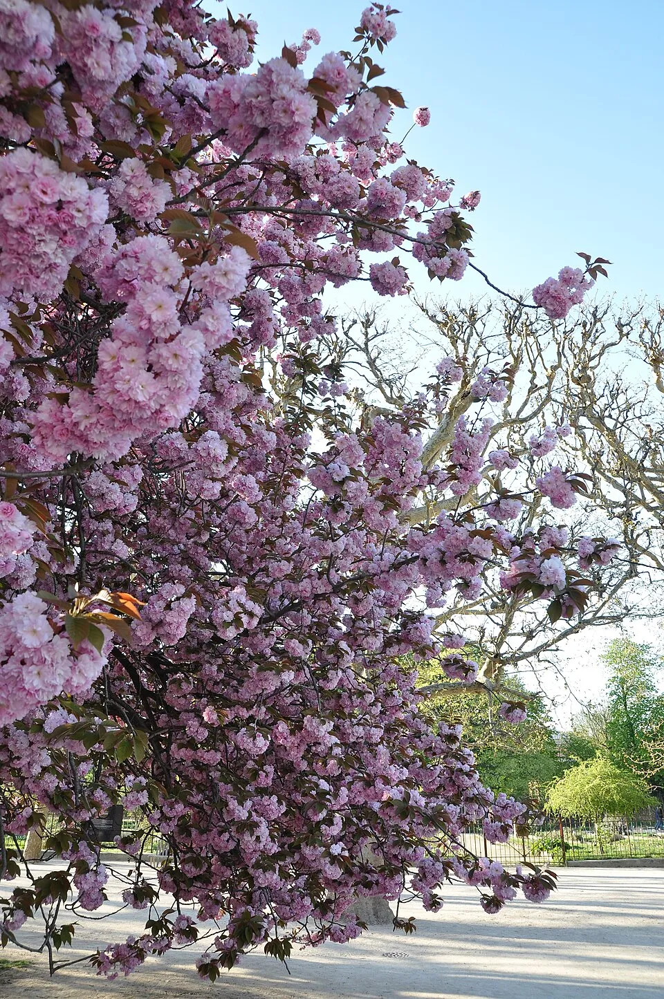 Ágai hegyesszögben állnak, fordított kúp alakú koronát visel. Oltástól függően talajtól ágas vagy magastörzsre oltva 7-10 méteres is lehet. Levele 8-12 cm hosszú, fakadáskor barnásvörös, később fényeszöld, ősszel sárgásvörös. Tömvetelt, sötét rózsaszínű virágai áprilisban nyílnak. Széles utcák fásítására, parkokba, facsoportokba vagy szoliter állásba ültessük.