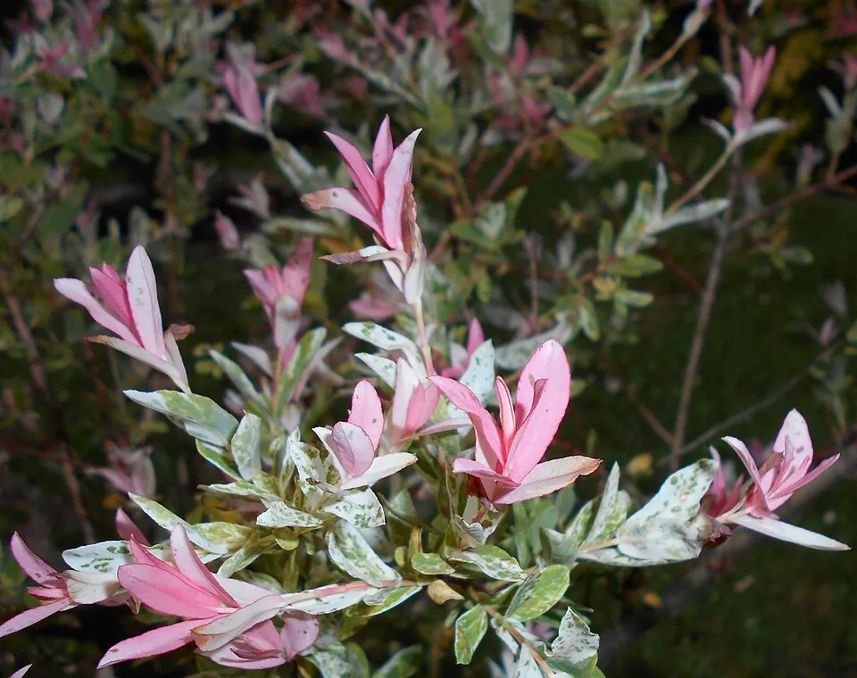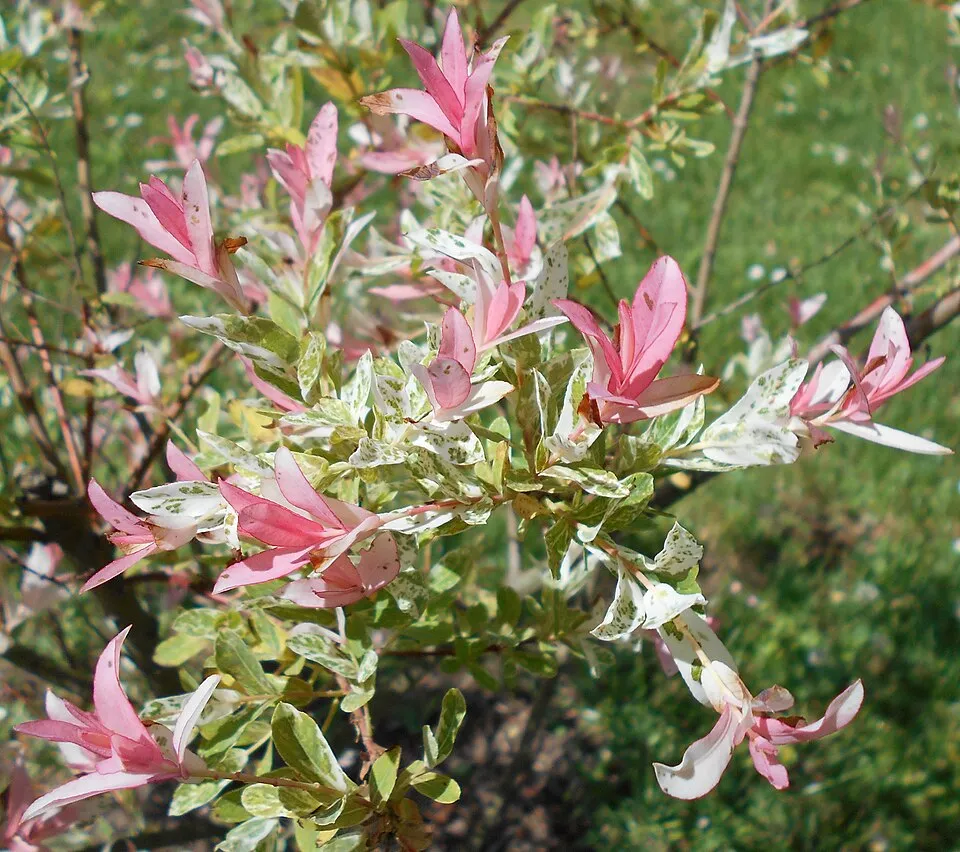 Általában 1,2-1,5 méter magas. Sűrű, vékony ágú, lassú növésű, bokor termetű fajta. Levelei hosszúkásak, tavasszal rózsaszín tarkán hajtanak ki, később krémfehérré válnak. Barkavirágzatai jelentéktelenek.