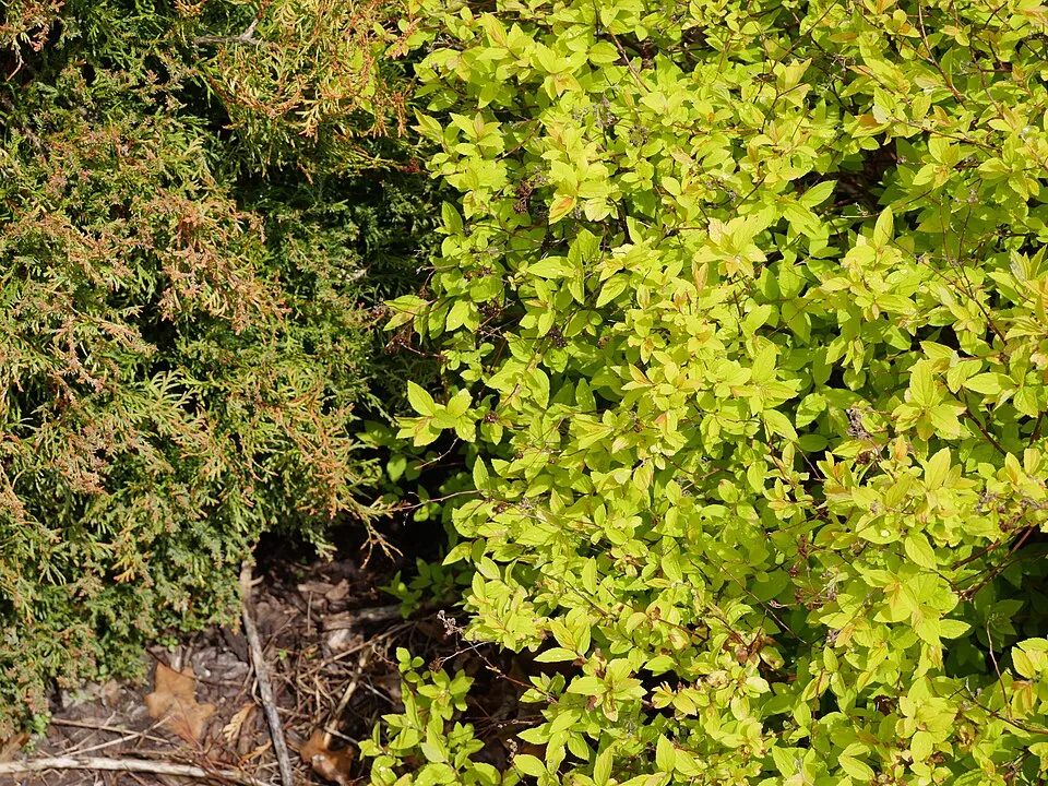 Sárgás levelű, rózsaszín virágú gyöngyvessző / Spiraea japonica 'Goldflame'