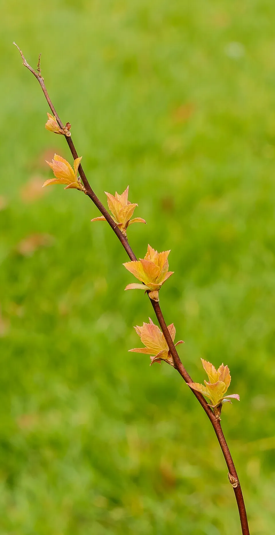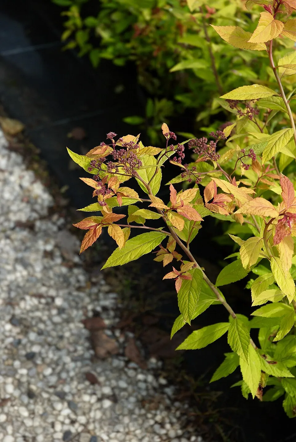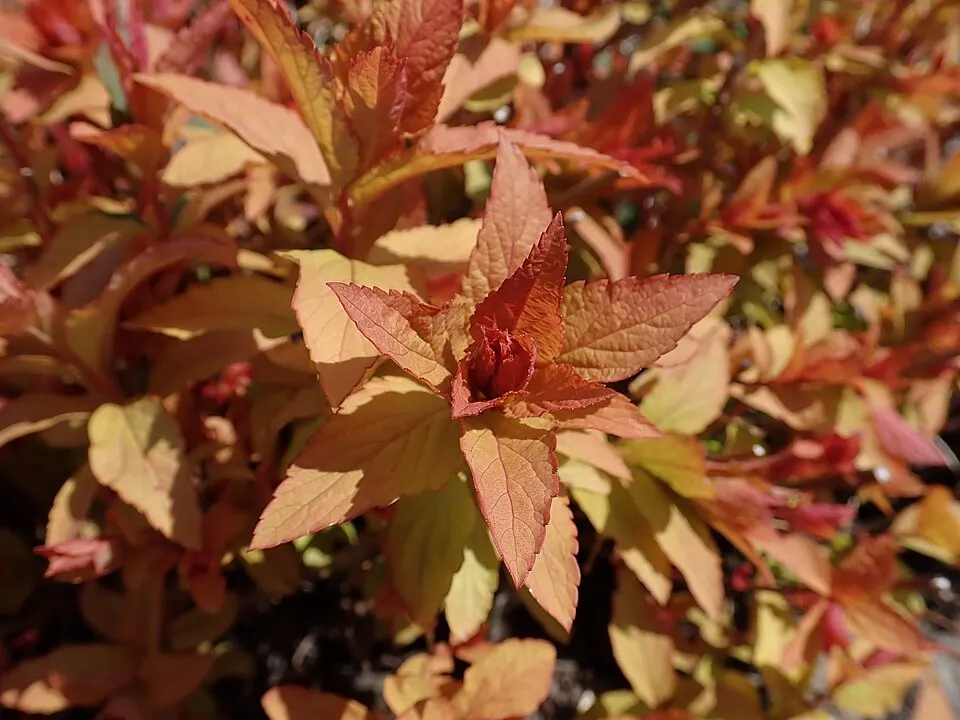 50-80 cm magas, tömött bokrú lombhullató cserje. Levelei 5-7 cm hosszú, kihajtáskor narancsvörösek, később élénksárgák, majd halványzöldek lesznek, ősszel rézvörösek, bevagdalt fűrészes széllel. Virágai lilás-vörösek, kitűnő kontrasztot alkotva a lombozat színével, mely így pompás látványt nyújt. Talajtakarónak, vagy alacsony sövénynek kiváló. Napos helyre, jó víz és tápanyaggazdálkodású talajba ültessük. Árnyékban lombja visszazöldül.