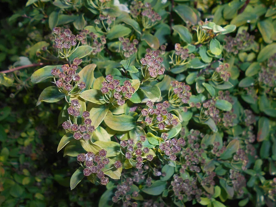 80-100 cm magas, nagyon tömött növésű, sűrű ágú lombhullató cserje. Levelei ovális, sötétzöld, fonákján kékeszöld. 5-8 mm-es széles, sok virágú, félgömbös sátorvirágzatban álló, fehér virágait május-júniusban hozza. Sziklakertekbe, edények beültetésére, sírokra vagy nyíratlan alacsony sövénynek alkalmas, rendkívül gazdagon virágzó cserje.