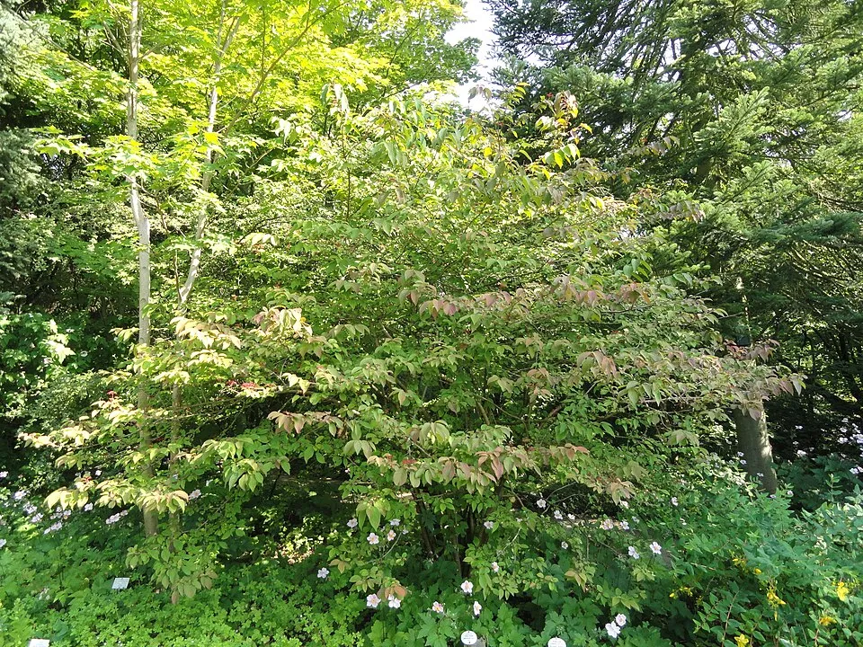 Felfelé törő ágrendszerű, széles, lombhullató cserje. 2-2,5 m magas. Levelei középzöldek, az őszi lombszín intenzív vörös színű. A virágbimbói rózsaszínűek, majd fehér színűre nyílnak, tányérszerű bogernyő virágzatot alkotnak, áprilisban-májusban virágoznak. A termései piros színű bogyók, amelyek szintén nagy díszítőértékkel rendelkeznek az őszi időszakban. Laza, üde, jó vízáteresztő képességű, tápanyagban gazdag talaj kedvez számára. Napos-félárnyékos helyre ültessük. A tűző napot nehezen viseli.