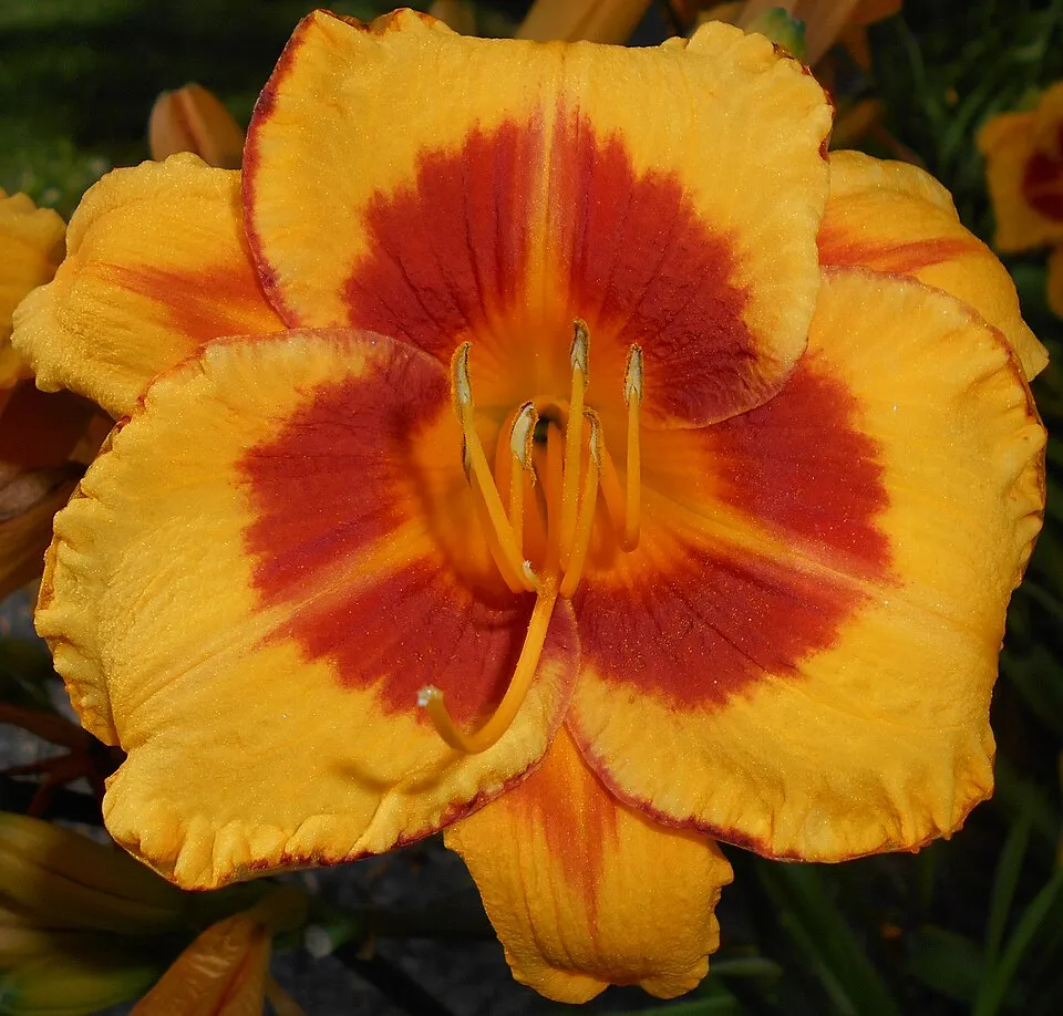 Virág színe: aranysárga, vörös szem és él, sárga torok