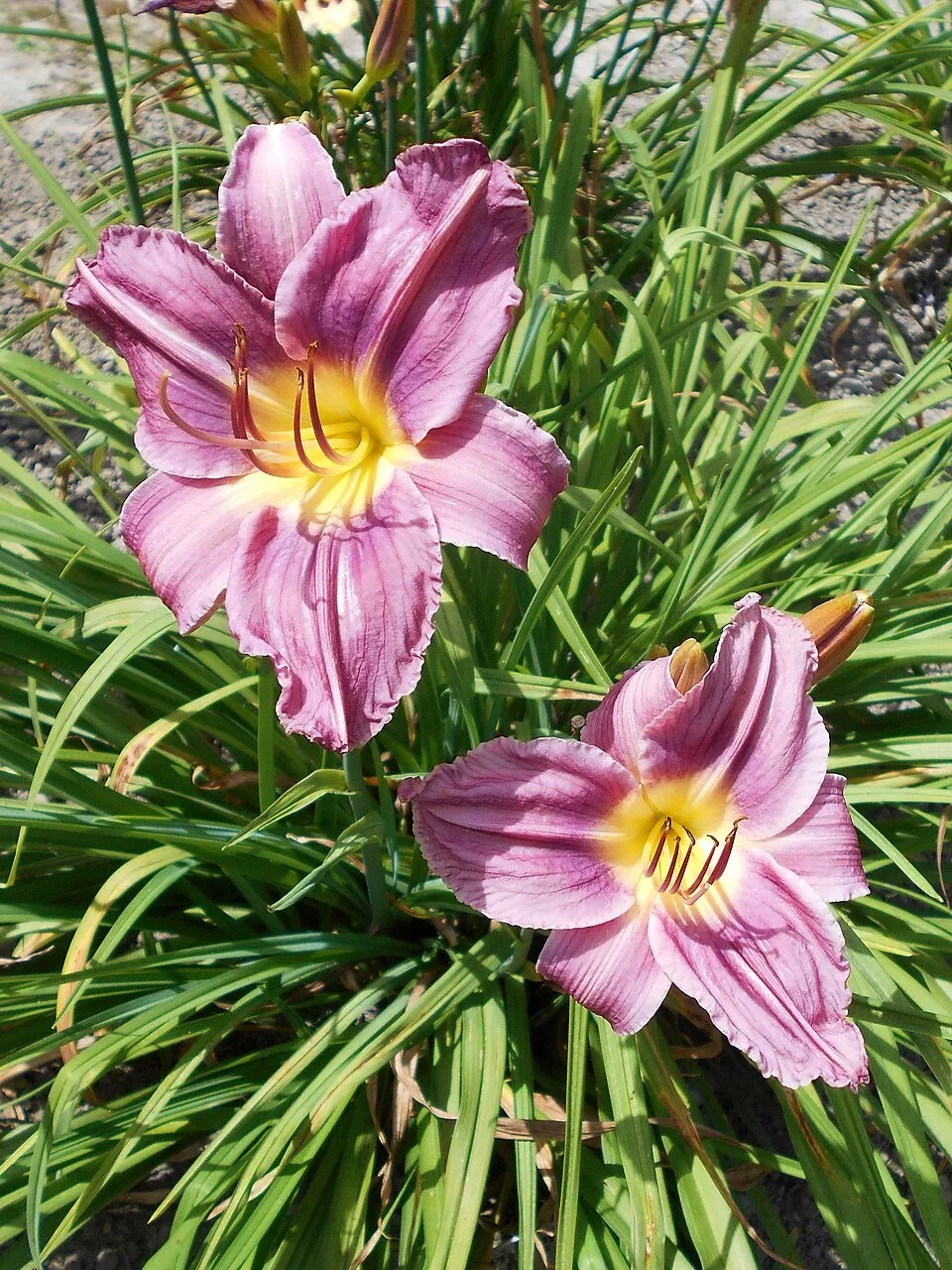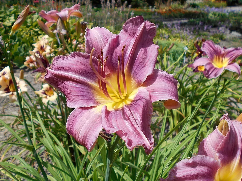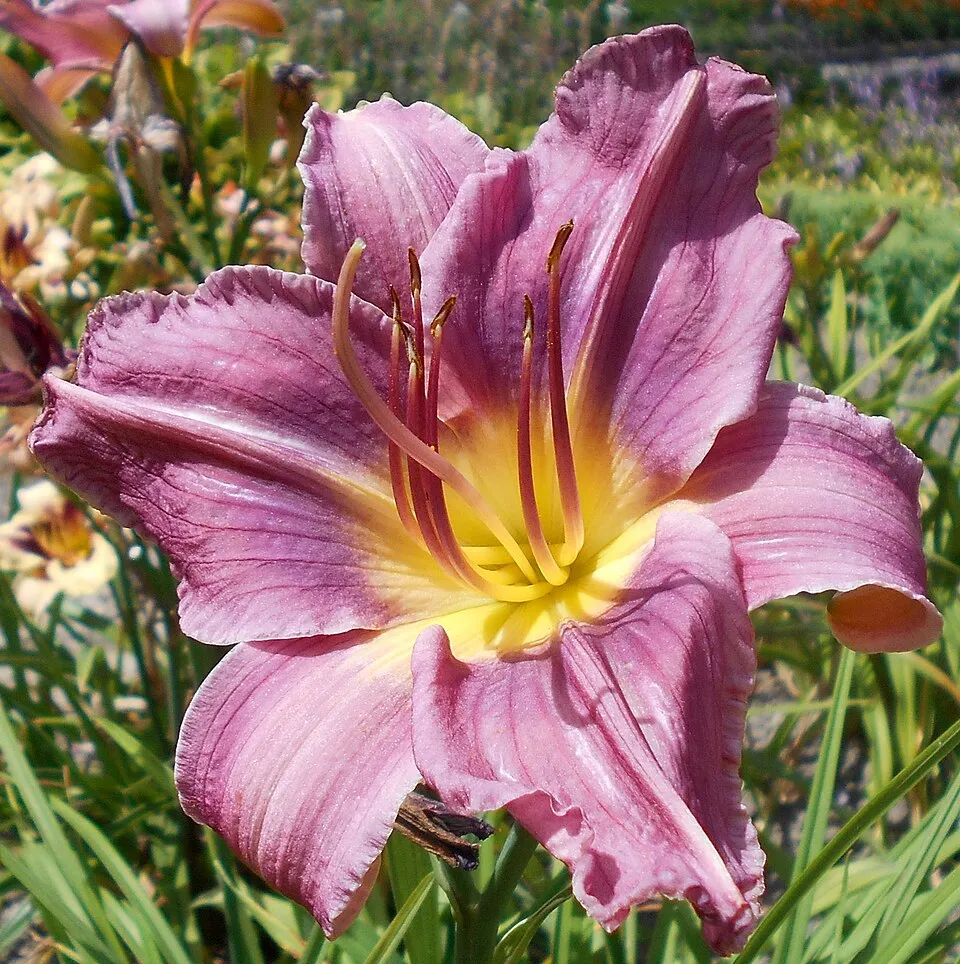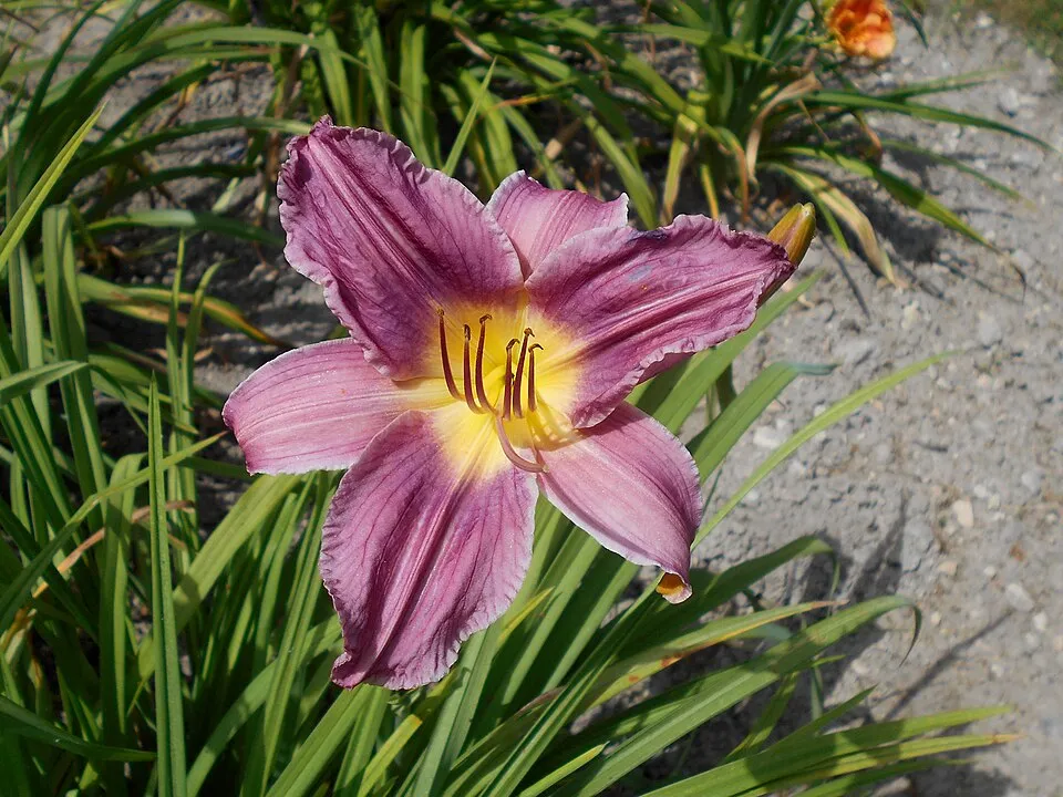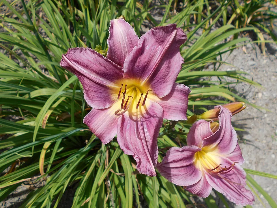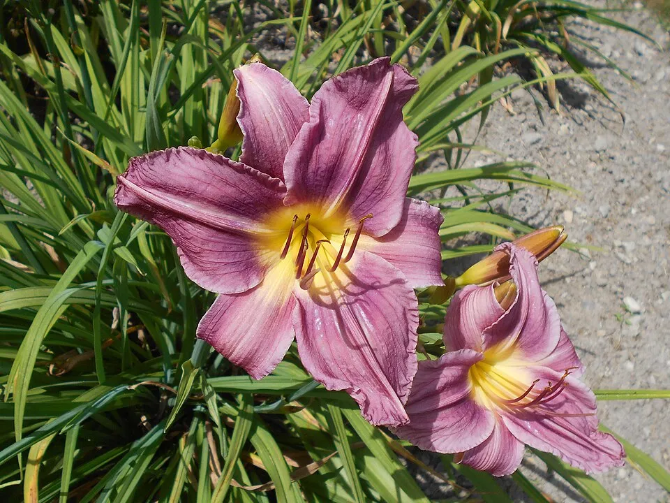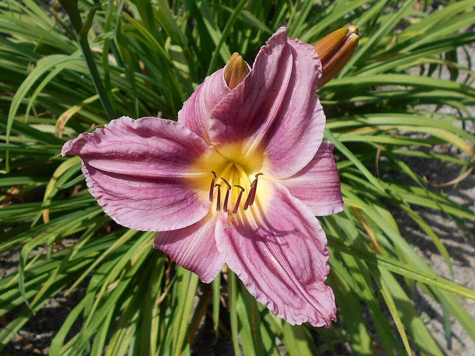 Sásliliom (Hemerocallis 'Prairie Blue Eyes') télálló évelő dísznövény; kisebb csoportban ültetve igazán látványos, de társnövények között is szépen érvényesül, és családbarát, könnyen gondozható választás. A kardos levelekből sűrű csomót nevel, és egymás után hozza nagy, tölcséres virágait; megbízható, könnyen tartható évelő. A(z) VI-VIII időszakban virágzik; mályva, sárgászöldes torok virágai üde színfoltot adnak, és a beporzó rovarok számára is vonzóak. Napos–félárnyékos fekvésben mutat a legszebben; jó vízáteresztő, tápdús talajban gyorsan beáll és erős tövet nevel. Ültetés után tartsd egyenletesen nyirkosan a talajt, később az időjárás szerint öntözd; mulcsozással csökkenthető a kiszáradás és a gyomosodás. Elvirágzás után a visszavágás és az elszáradt részek eltávolítása rendezett megjelenést ad, és sok fajnál újabb virágzási hullámot is ösztönözhet.